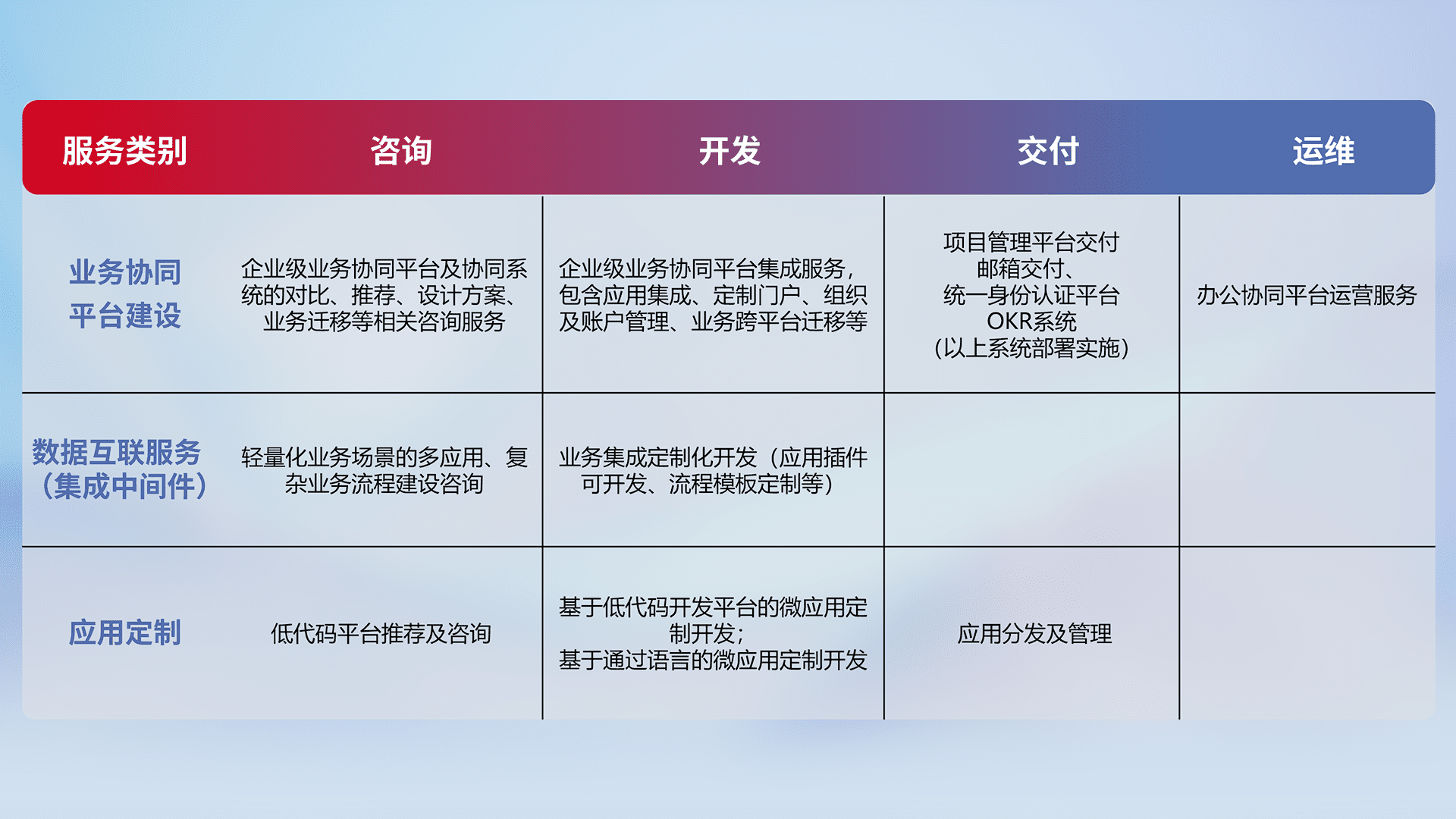针对钉钉、、、企微、、、、IDaas等平台级产品提供产品的规划、、方案、、、、交付、、定制化开发等服务,,,实现如统一协同办公、、智能客户服务、、、、混合会议管理、、、、智能数据查询、、、、等业务场景,,,实现数字化转型。。。