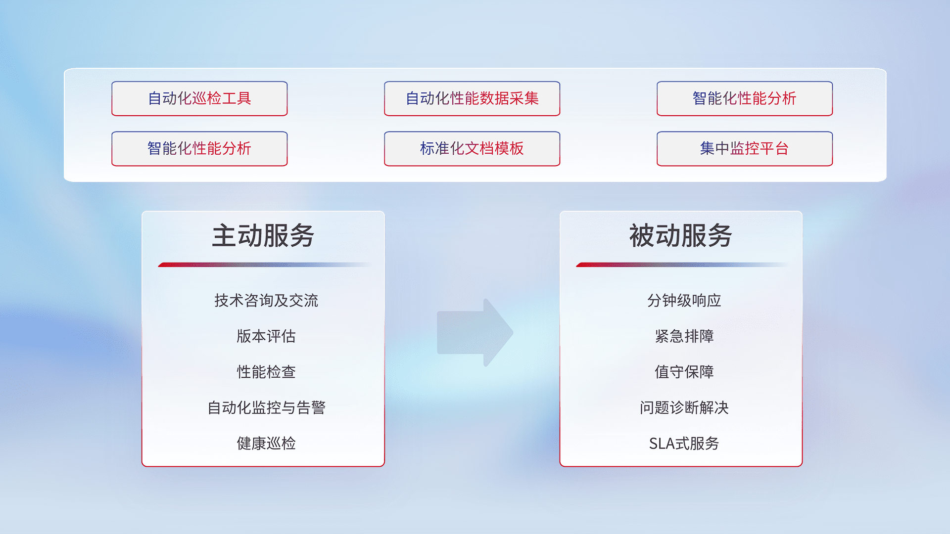 智能化工具和标准化文档,,保障服务质量,,,提供主动服务(包含技术咨询、、、、版本评估、、性能检查、、、自动化监控与告警、、、健康巡检)和被动服务包含(分钟级响应、、、紧急排障、、、值守保障、、问题诊断解决、、、、SLA服务)。。。。